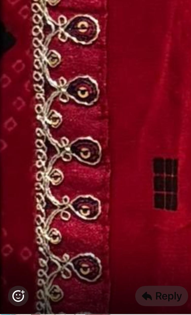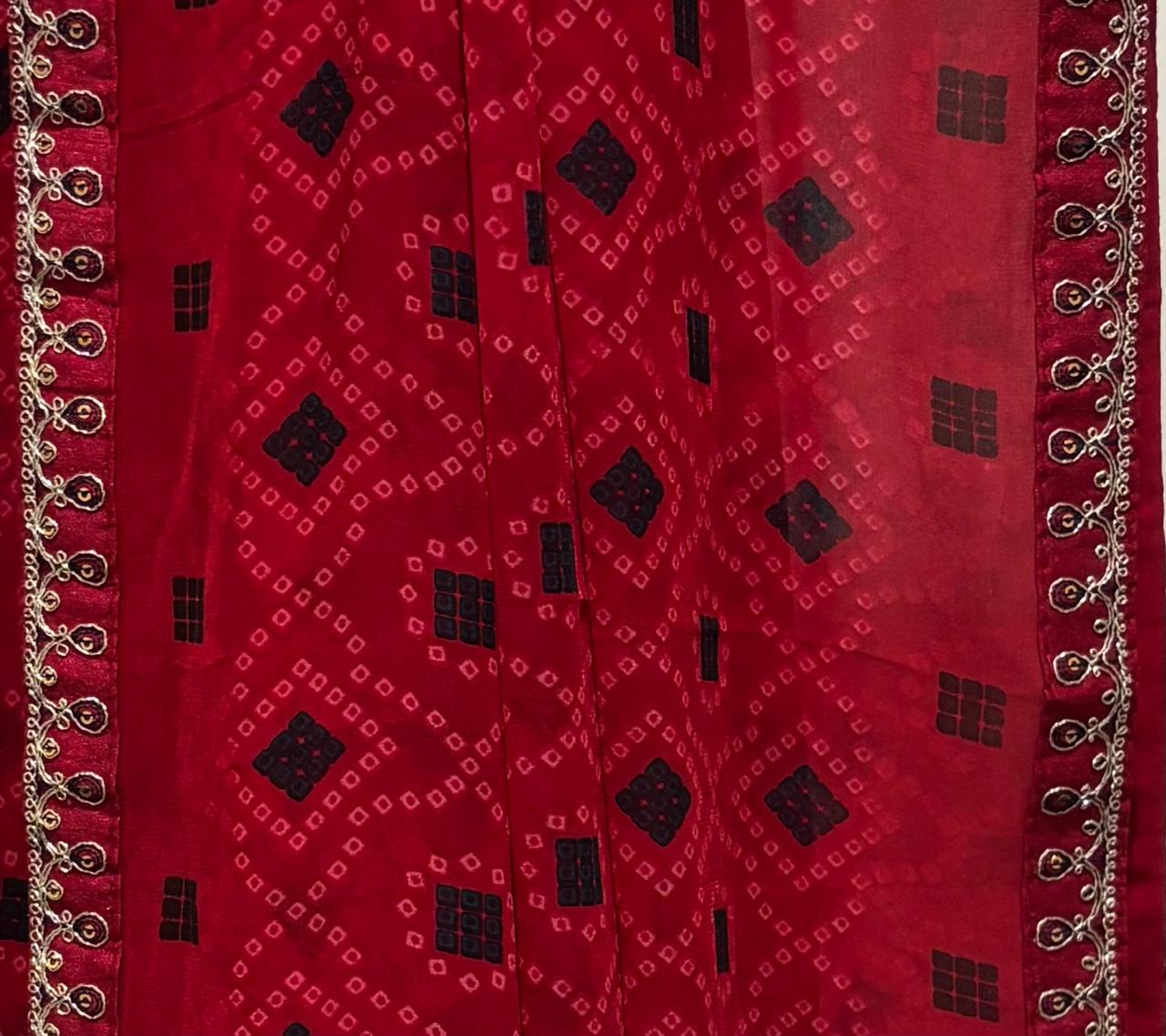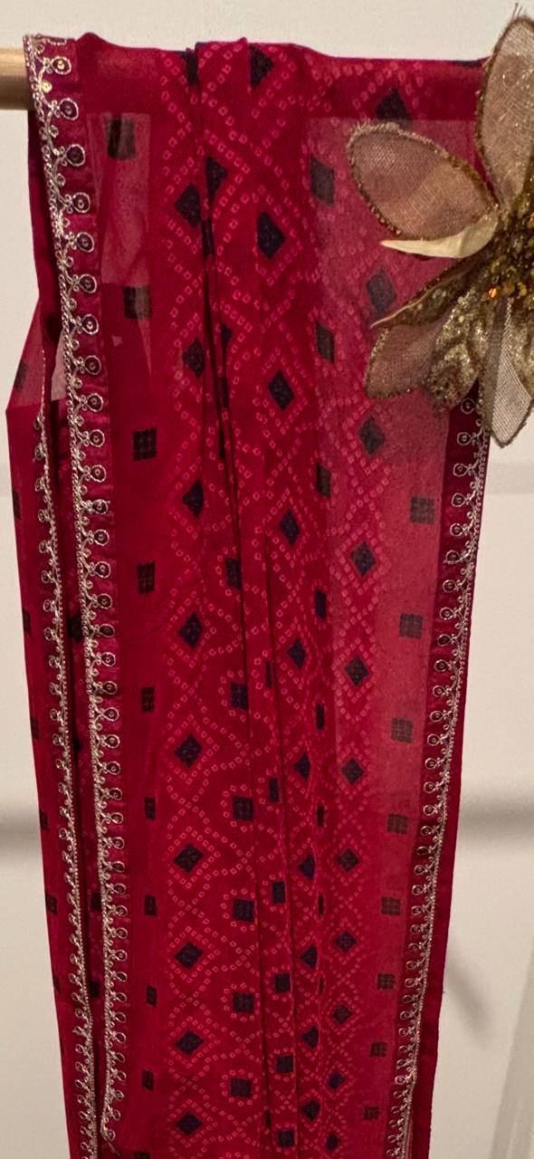 Celebrate timeless tradition with a modern twist in our Gulnaar Bandhini Pre-Draped Chiffon Georgette Saree. Featuring a rich Crimson Red base with traditional black Bandhini motifs and a delicate golden zari border, this ready-to-wear saree embodies effortless grace. Designed with an adjustable waist (24"-44"), it offers a flattering fit for all body types. Lightweight chiffon georgette ensures an elegant drape and fluid movement—ideal for festive occasions, weddings, and evening gatherings. Simply slip it on and glow with confidence—drape in a minute, dazzle all day.