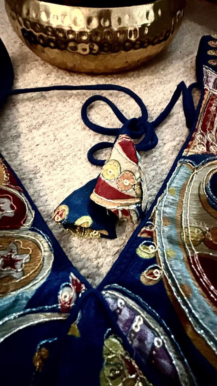 Work: Multicoloured embroidery with gold zari & sequins
