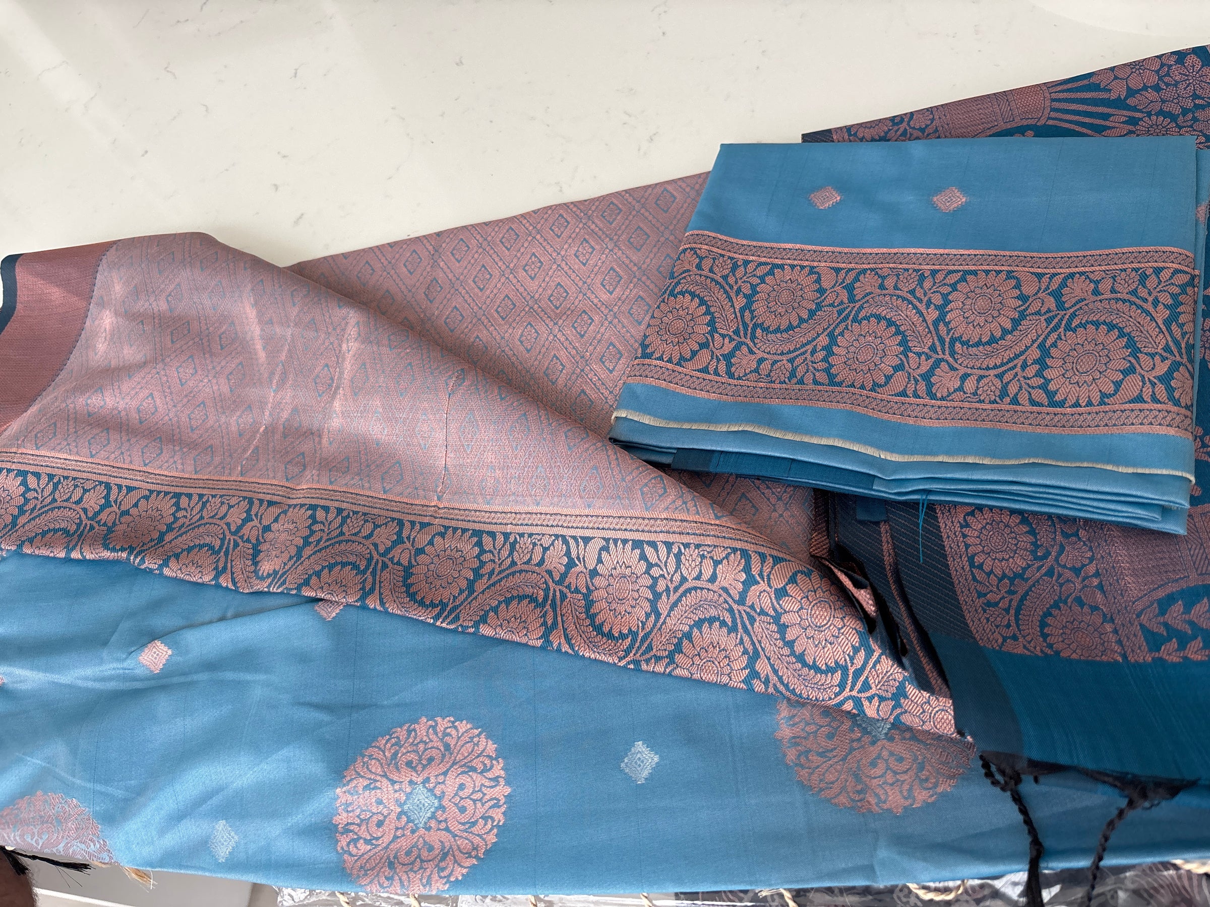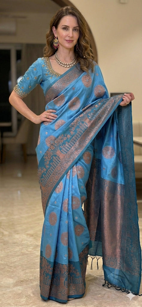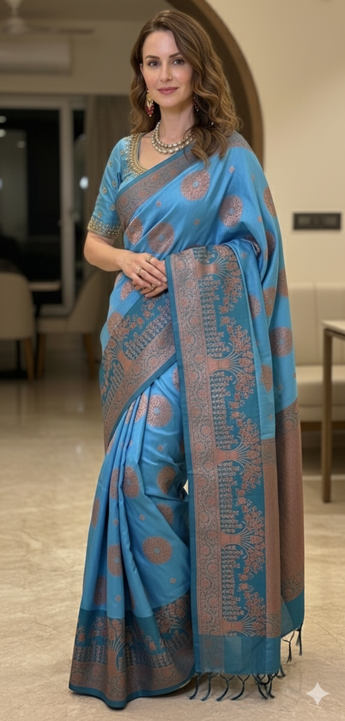 ✨ Elevate your style with this captivating pre-draped saree, featuring a stunning blend of sky blue and deep navy tones. Accented with soft rose gold zari/brocade work along the borders and pallu, this saree strikes the perfect balance between traditional elegance and modern flair. 🌌
