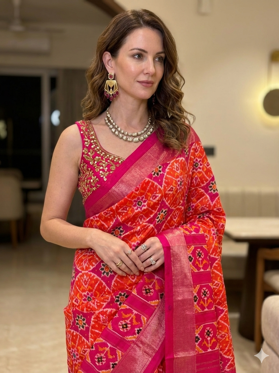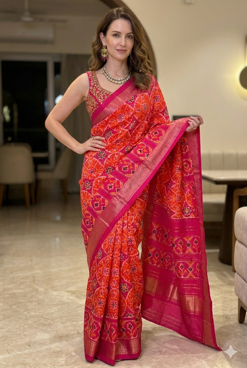 Vibrant Pre-Draped Patola Silk Saree – A Perfect Blend of Tradition and Modernity 💖🧡