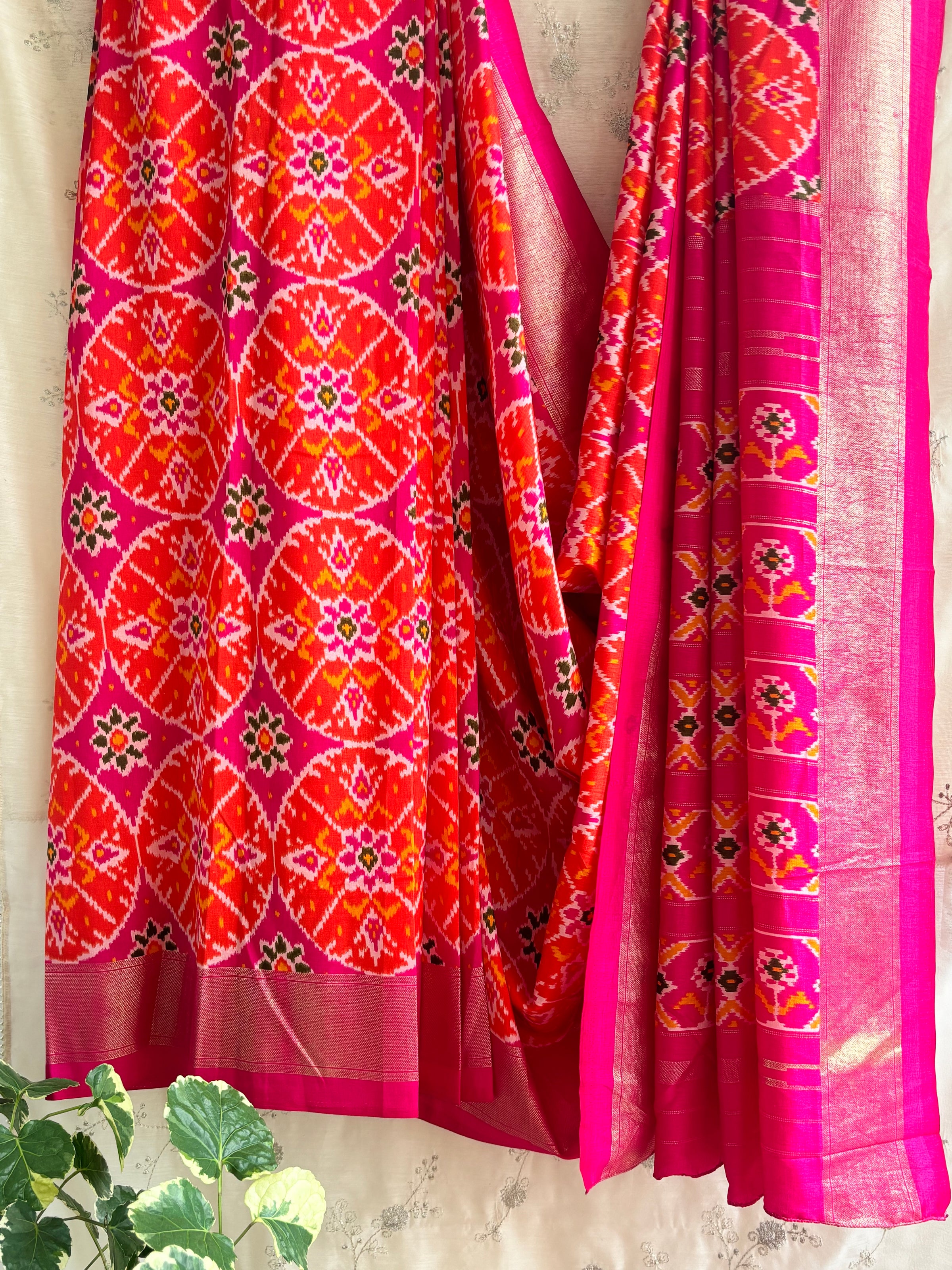 A must-have for any festive wardrobe, this vibrant saree is a striking fusion of traditional Patola design and contemporary convenience. Crafted from luxurious soft silk, it features a vivid palette of bright pink and orange hues that create a bold, eye-catching look. The timeless Patola ikat patterns bring a touch of heritage elegance to this modern masterpiece. 🎨✨