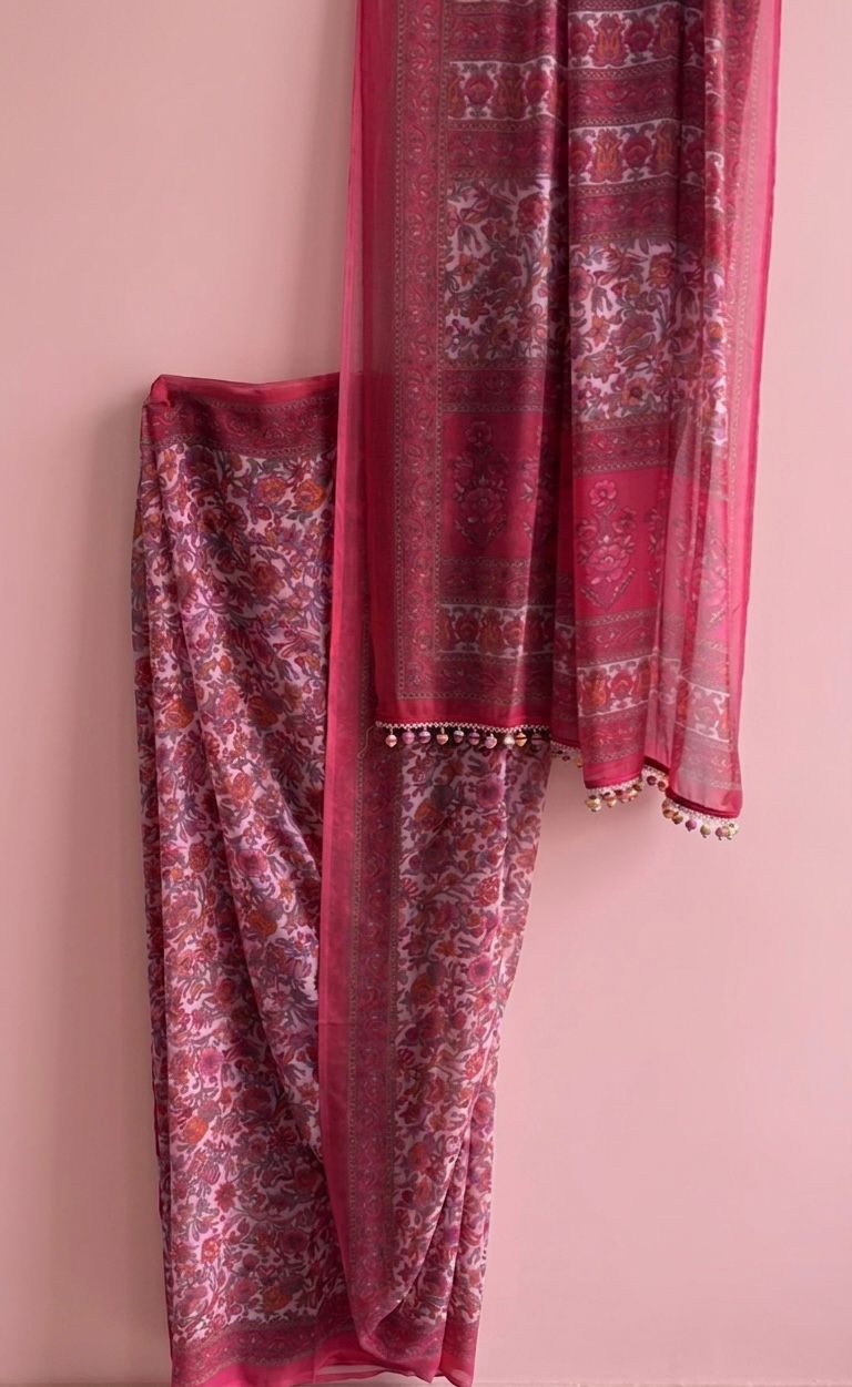 Garden Whispers: Floral Chiffon Georgette pre-draped Sarees with Beaded Tassels