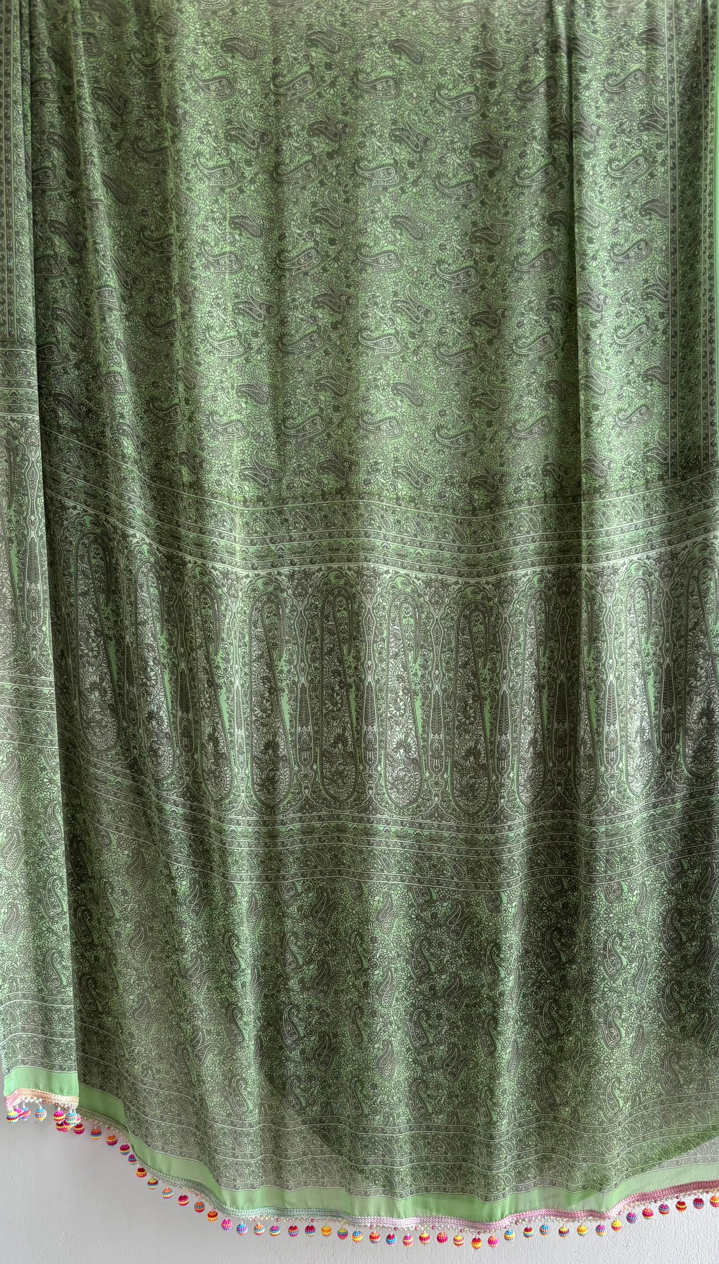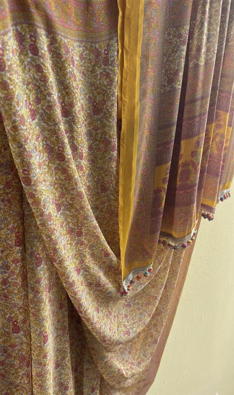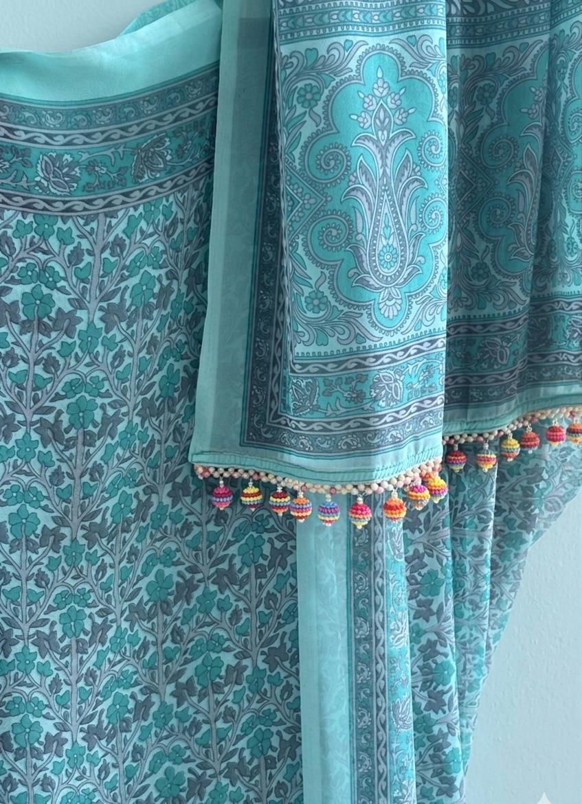 Lightweight chiffon georgette fabric |Ā All-over floral & paisley prints | Multi-colour beaded tassel pallu edging |Ā Flowing, elegant drape | Ā Bright summer-ready colour palette ideal for festive daywear, vacations, and celebrations.