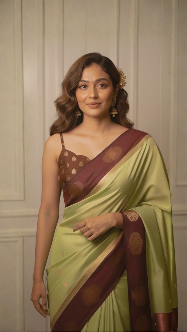 Discover the elegance of the Harit Aruna pre-draped Kanjivaram saree, a stunning fusion of nature's lime green freshness and the regal warmth of maroon. This artisanal masterpiece is crafted from luxurious soft silk, featuring a refreshing green body adorned with delicate gold zari brocade motifs. The contrast between the light green and the deep maroon pallu and floral brocade border creates a perfect balance of elegance and boldness.