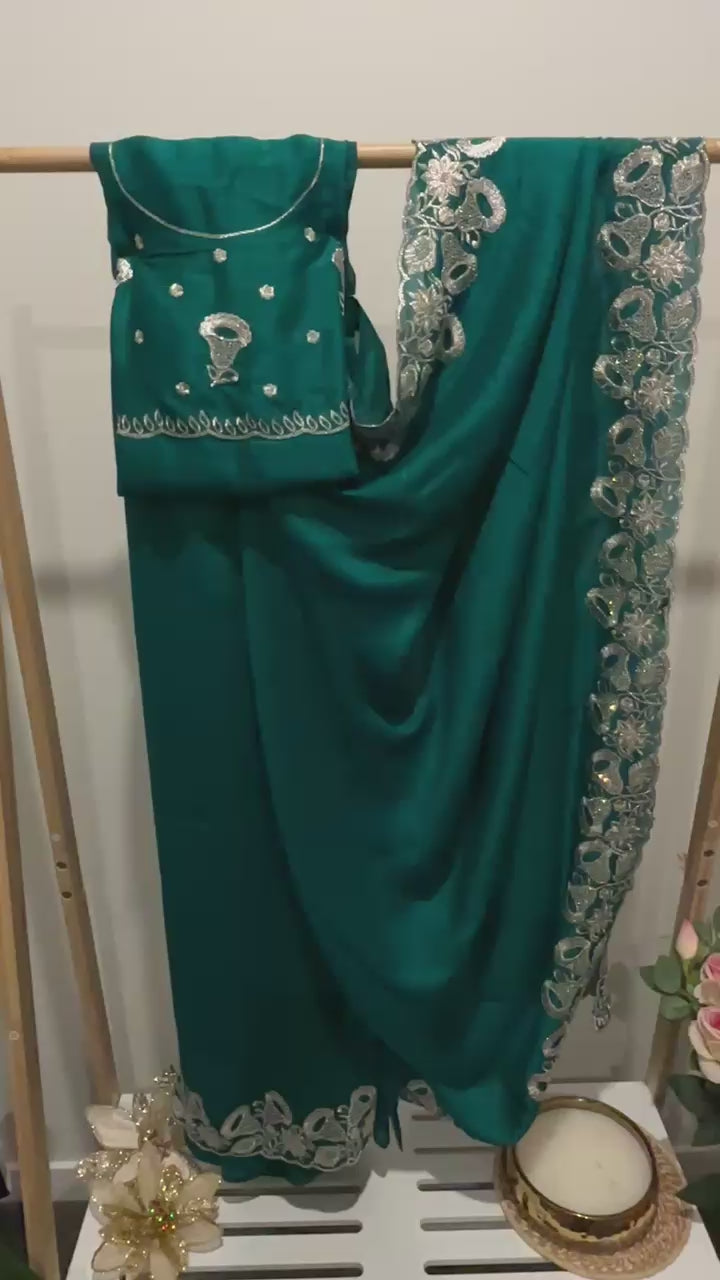 Emerald Enchanté Pre-Draped Crepe Chiffon Saree with Silver zari and sequins